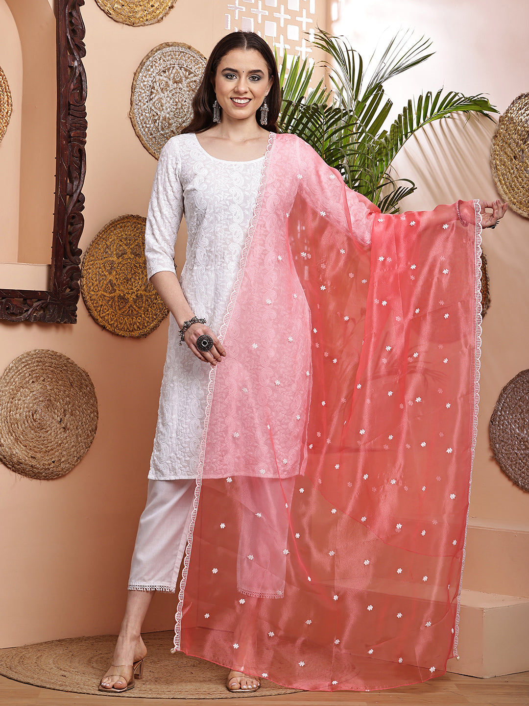 Organza is a thin, plain weave, sheer fabric traditionally made from silk. Its lightweight, semi-transparent, and somewhat shiny properties The intricate design is scalloped and embroidered with white colored embroidery on dupatta. Cornered are kaudi tasseled to behold it. Digital Prints for that modern touch.