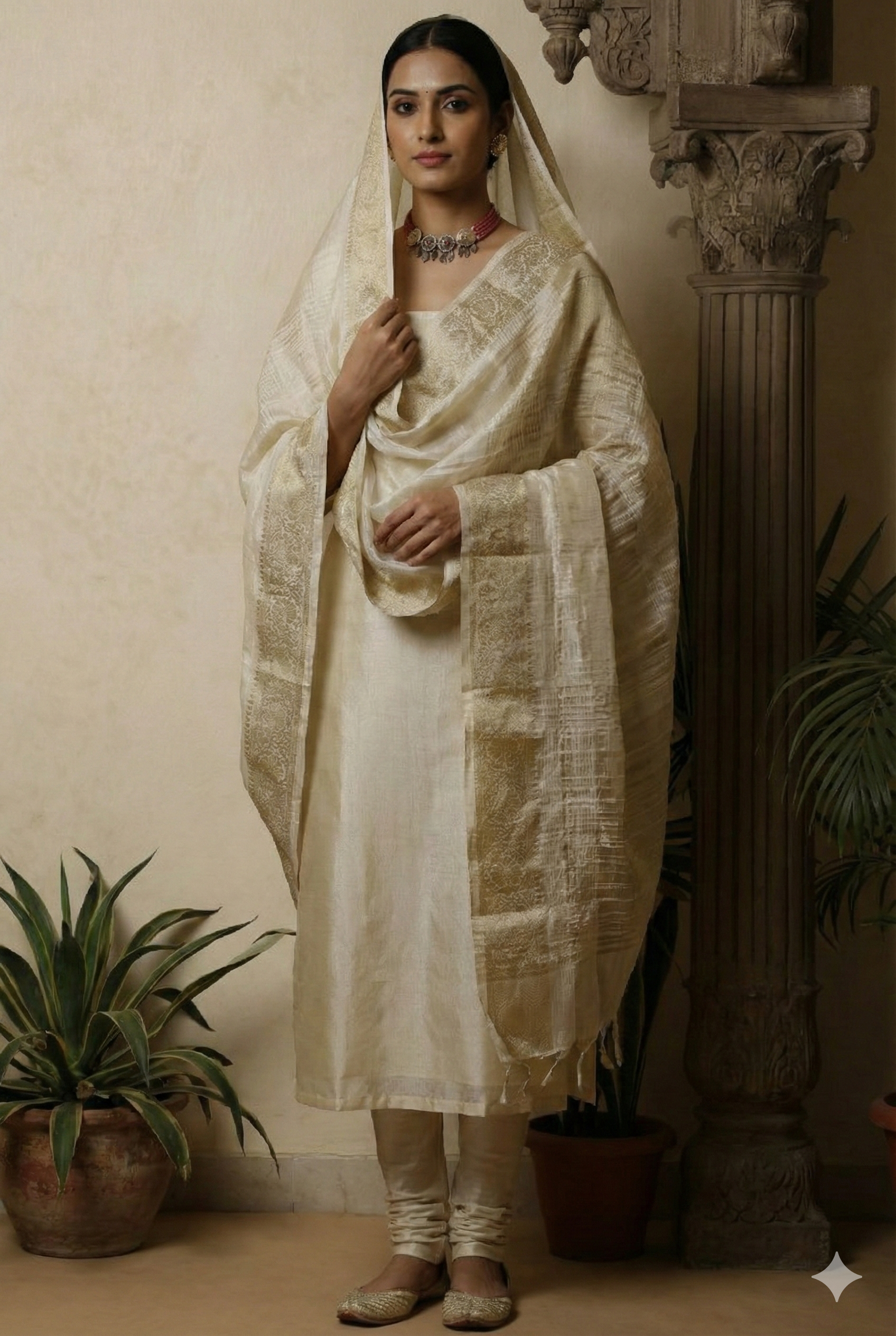 Ivory Gold Dupatta with Matching Suit Fabric