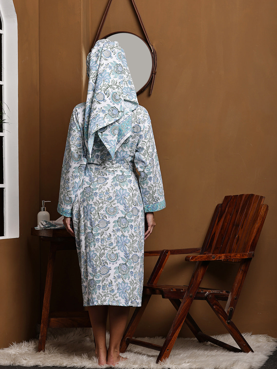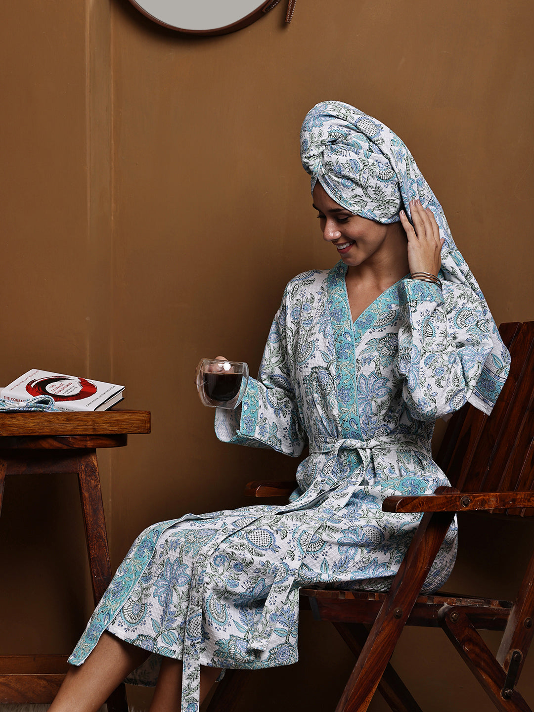 Luxury Waffle Cotton Bathrobe & Towel Gift Set – Handblock Print- Green Tropical